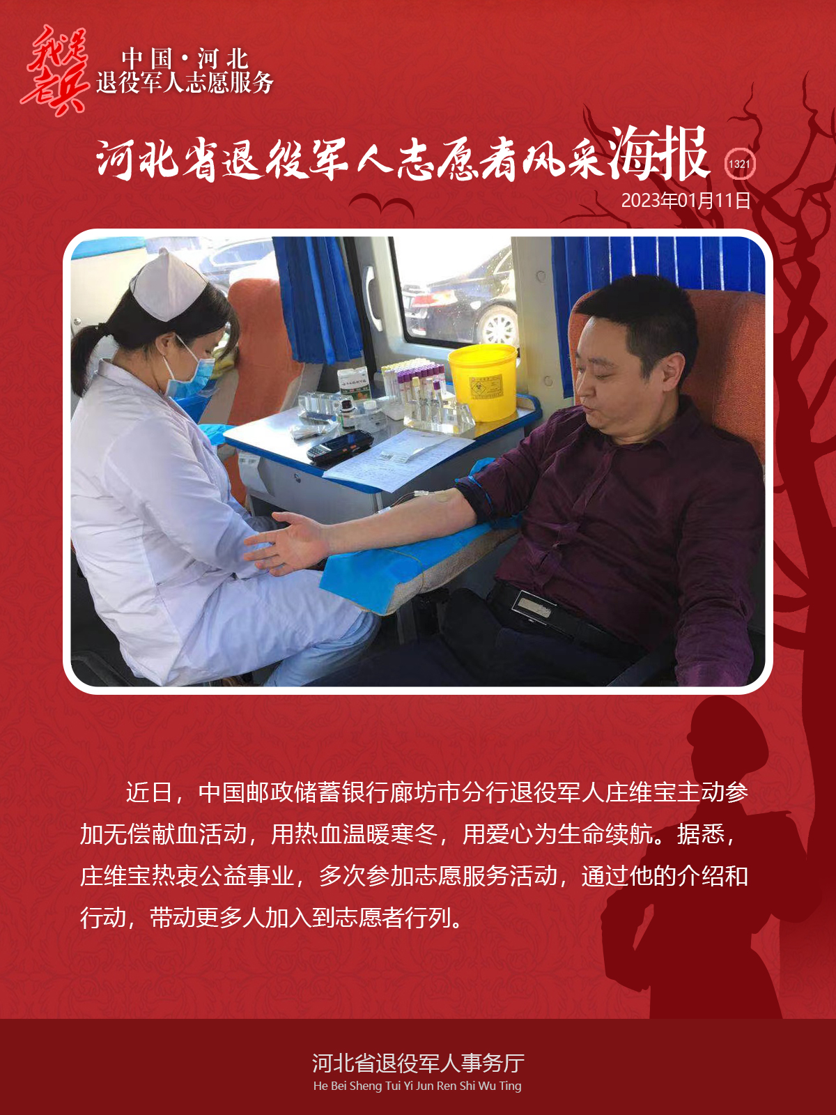 长城网·冀云客户端讯(记者 何震)近日,中国邮政储蓄银行廊坊市分行退役军人庄维宝主动参加无偿献血活动,用热血温暖寒冬,用爱心为生命续航。据悉,庄维宝热衷公益事业,多次参加志愿服务活动,通过他的介绍和行动,带动更多人加入到志愿者行列。