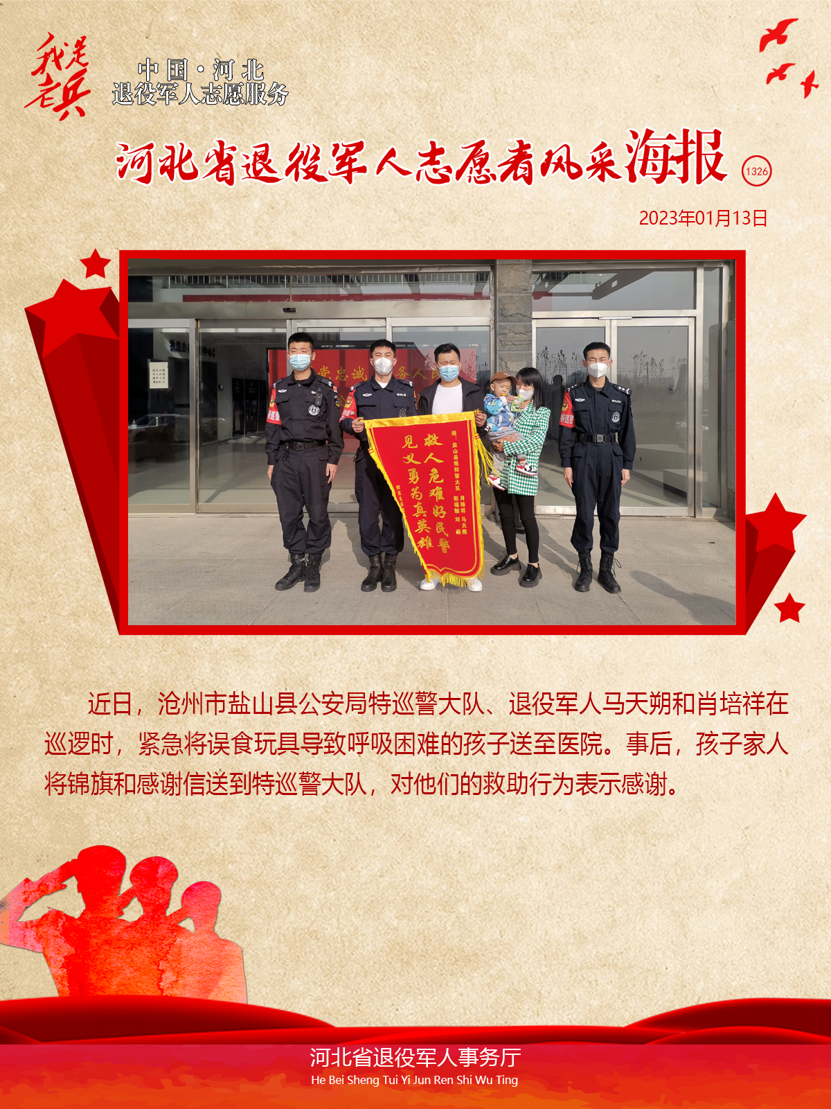 近日,沧州市盐山县公安局特巡警大队队员收到群众送来的锦旗和感谢信,对该队退役军人马天朔和肖培祥在巡逻时紧急救助因误食玩具导致呼吸困难的孩子表示感谢。