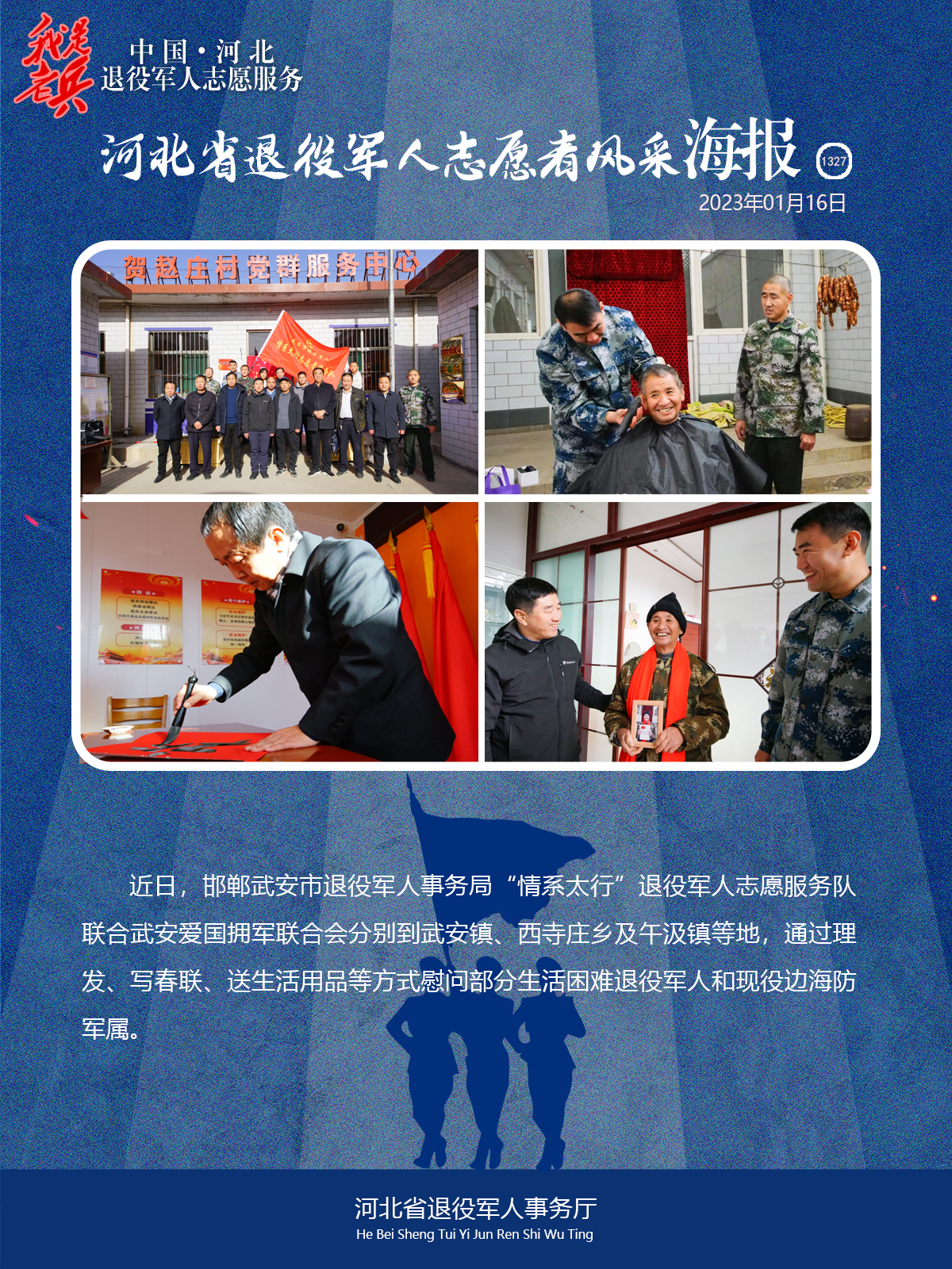 长城网·冀云客户端讯(记者 何震)近日,邯郸武安市退役军人事务局“情系太行”退役军人志愿服务队联合武安爱国拥军联合会分别到武安镇、西寺庄乡及午汲镇等地,通过理发、写春联、送生活用品等方式慰问部分生活困难退役军人和现役边海防军属。