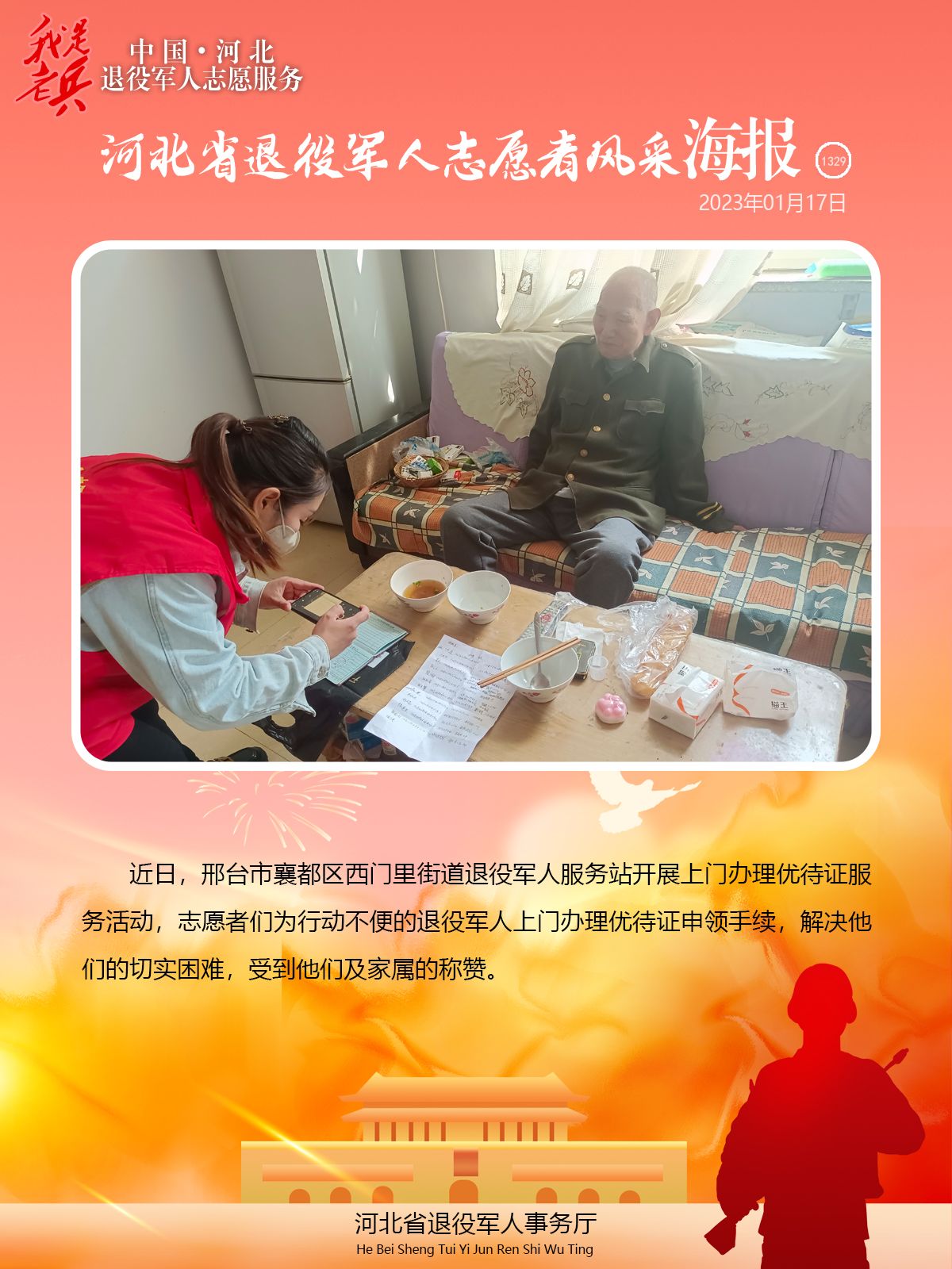 长城网·冀云客户端讯(记者 何震)近日,邢台市襄都区西门里街道退役军人服务站开展上门办理优待证服务活动,志愿者们为出行不便的退役军人上门办理优待证申领手续,解决他们的切实困难,受到他们及家属的称赞。