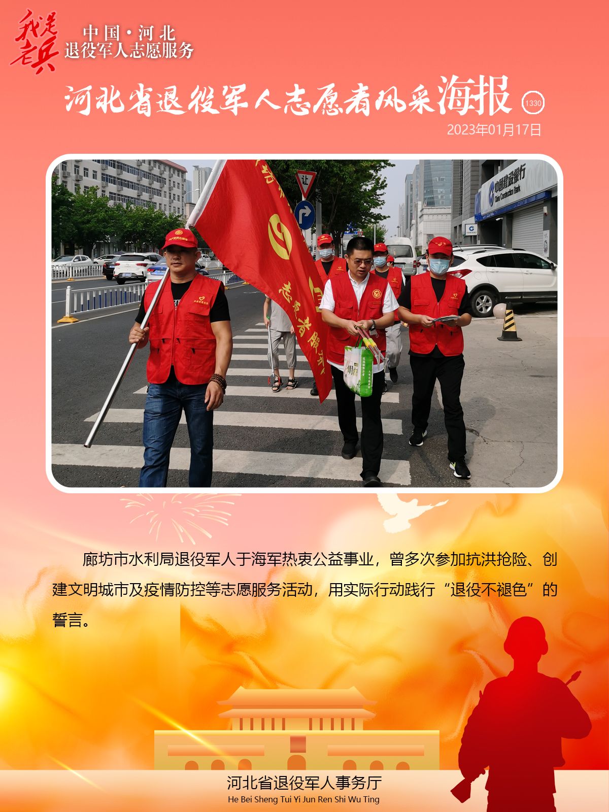 廊坊市水利局退役军人于海军热衷公益事业,曾多次参加抗洪抢险、创建文明城市及疫情防控等志愿服务活动,用实际行动践行“退役不褪色”的誓言。