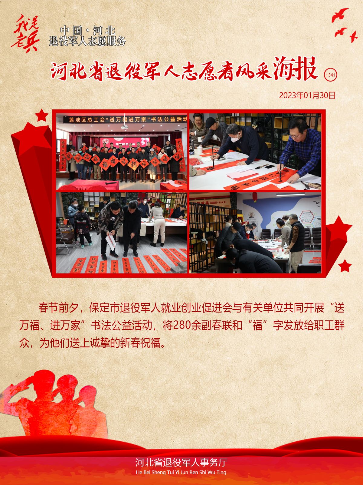 长城网·冀云客户端讯(记者 何震)春节前夕,保定市退役军人就业创业促进会与有关单位共同开展“送万福、进万家”书法公益活动,将280余副春联和“福”字发放给职工群众,为他们送上诚挚的新春祝福。