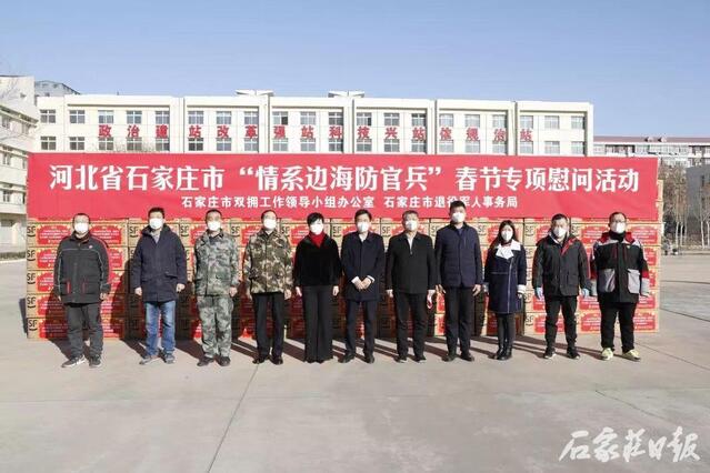 市双拥办、市退役军人事务局高度重视节日期间拥军优属工作,春节前夕组织退役军人事务部门和各级爱国拥军志愿者联合会集中走访慰问边海防官兵、部分执行维和任务官兵等现役军人家属,了解军属现实需求,解决官兵后顾之忧,进一步激发军人的荣誉感、责任感、使命感和昂扬斗志。为做好“情系边海防官兵”春节专项慰问活动,市双拥办、市退役军人事务局专门设计印制了石家庄解放75周年宣传折页,制作了印有石家庄解放纪念碑等城市标志的祝福贺卡,采购巧克力、干果等特色节日食品和赵县雪梨干、赞皇黑花生等具有石家庄地域特色的慰问品,用心用情表达对子弟兵最淳朴的美好祝愿。