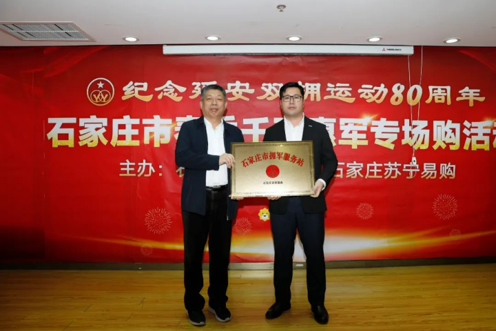 活动中,市双拥办为爱国拥军企业石家庄苏宁易购生活广场颁授拥军服务站标牌。苏宁易购河北区域总经理魏昊代表主办单位致辞,苏宁易购石家庄运营总经理杜志勇解读“春季千万惠军石家庄专场购”活动补贴政策,各县(市、区)与会人员观摩了苏宁易购生活广场拥军惠军套餐产品展示。