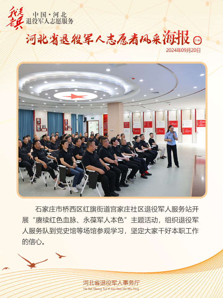 石家庄市桥西区红旗街道宫家庄社区退役军人服务站开展“赓续红色血脉、永葆军人本色”主题活动,组织退役军人服务队到党史馆等场馆参观学习,坚定大家干好本职工作的信心。