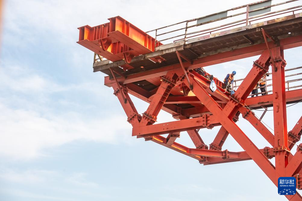 4月19日,在重庆黄桷沱长江大桥建设现场,工人在架设先导索。