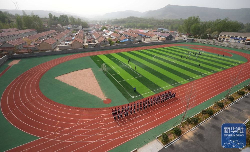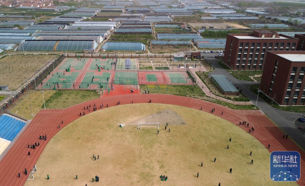 ↑ 位于潍坊寿光市八里庄村的寿光市文圣学校(4月17日摄,无人机照片)。操场铺设了塑胶跑道。