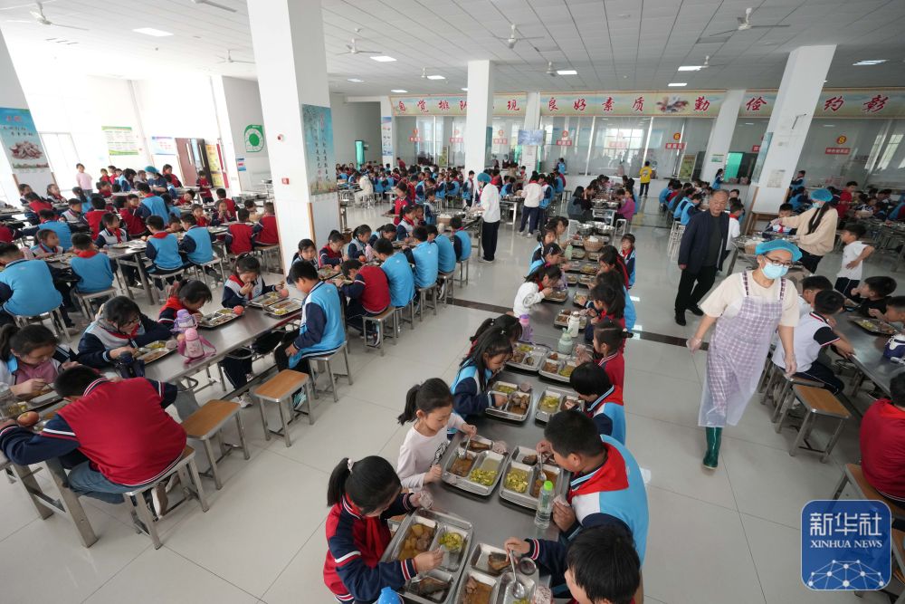 ↑ 4月17日,在位于潍坊市寿光市羊口镇的寿光市羊口新区小学,学生在学校食堂吃午餐。