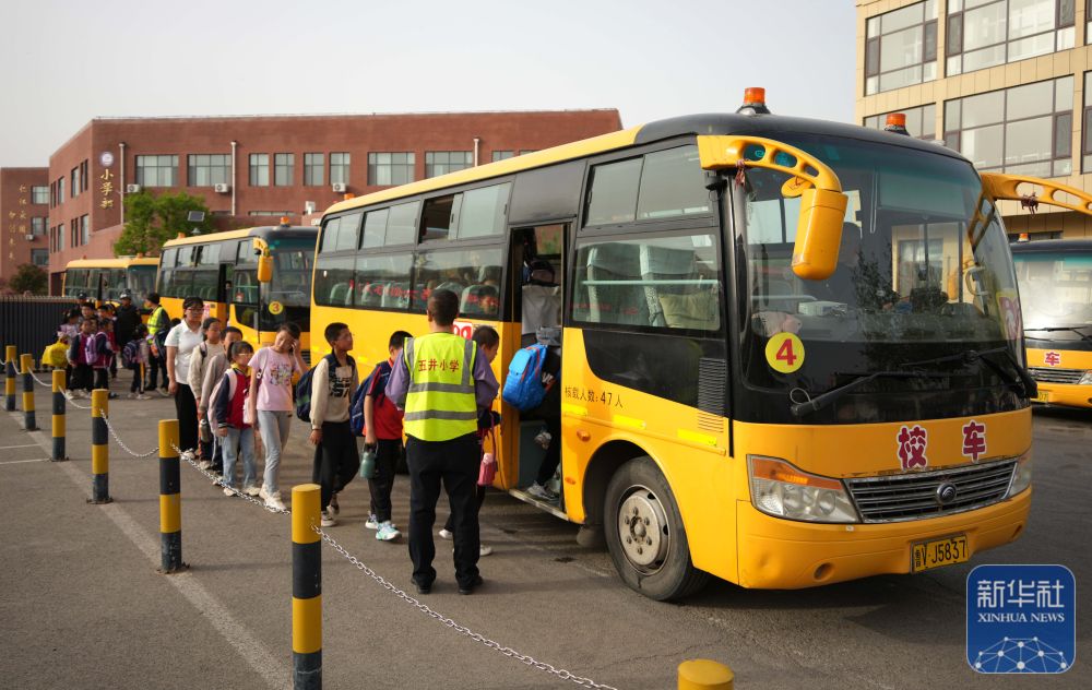 ↑ 4月17日,在潍坊市临朐县五井镇五井小学,学生排队乘坐校车离校。