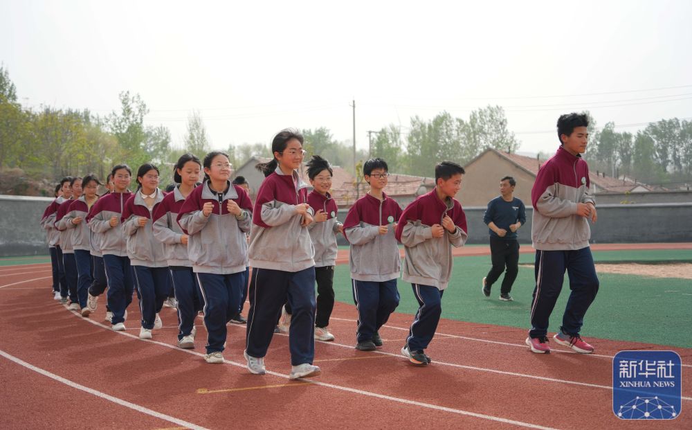 ↑ 4月17日,在位于潍坊市临朐县石家河村的临朐县弥水教育集团石家河校区,学生在操场塑胶跑道上进行体育锻炼。