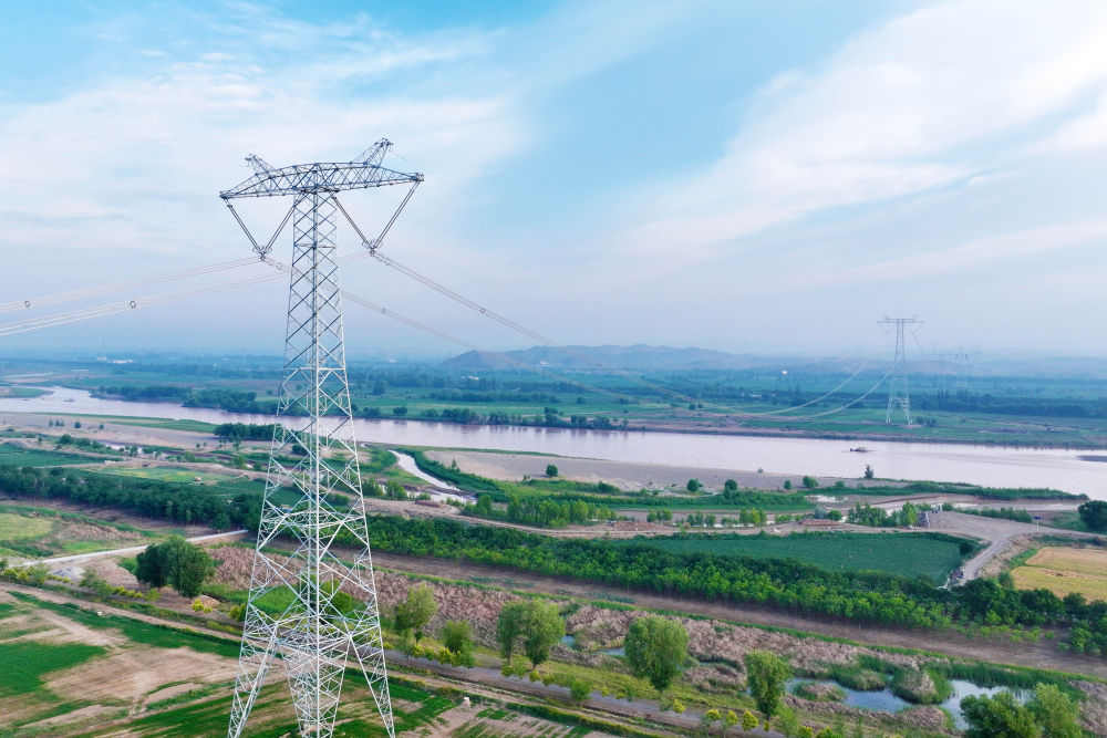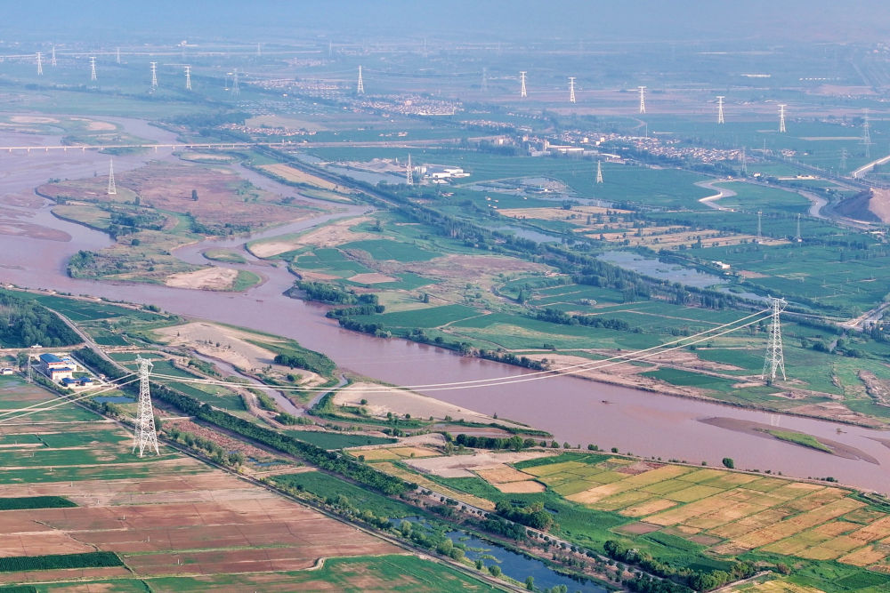 ↑ 这是6月29日拍摄的“宁电入湘”工程宁夏中卫市境内跨黄河段线路(无人机照片)。新华社发(袁宏彦 摄)