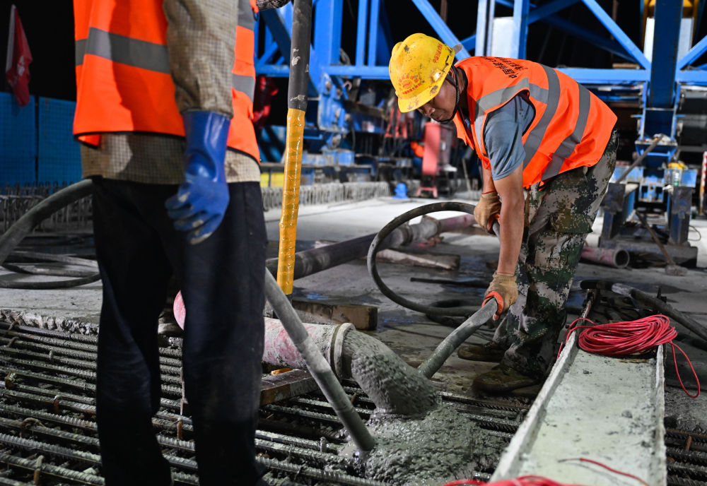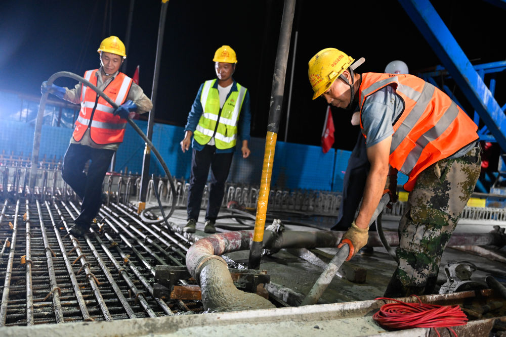 ↑6月30日晚,中国铁建大桥局施工人员在施工现场进行浇筑作业。