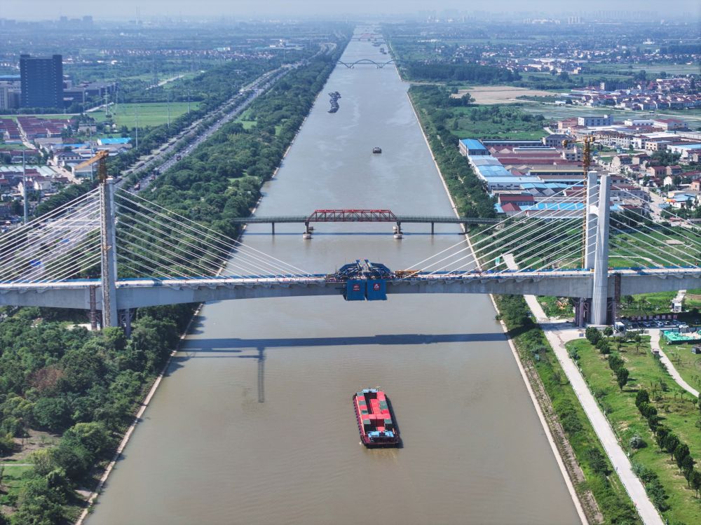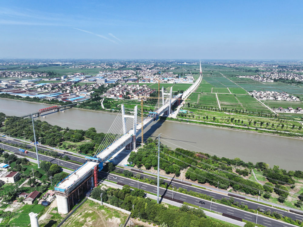 ↑7月1日拍摄的沪渝蓉高铁通泰扬特大桥跨引江河斜拉桥(无人机照片)。