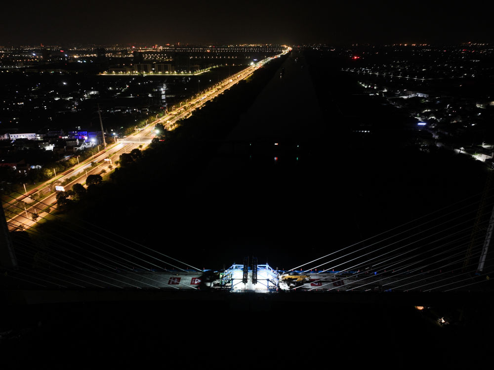 ↑6月30日晚拍摄的沪渝蓉高铁通泰扬特大桥跨引江河斜拉桥施工现场(无人机照片)。