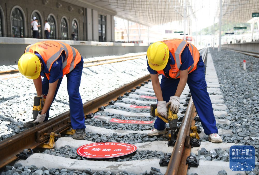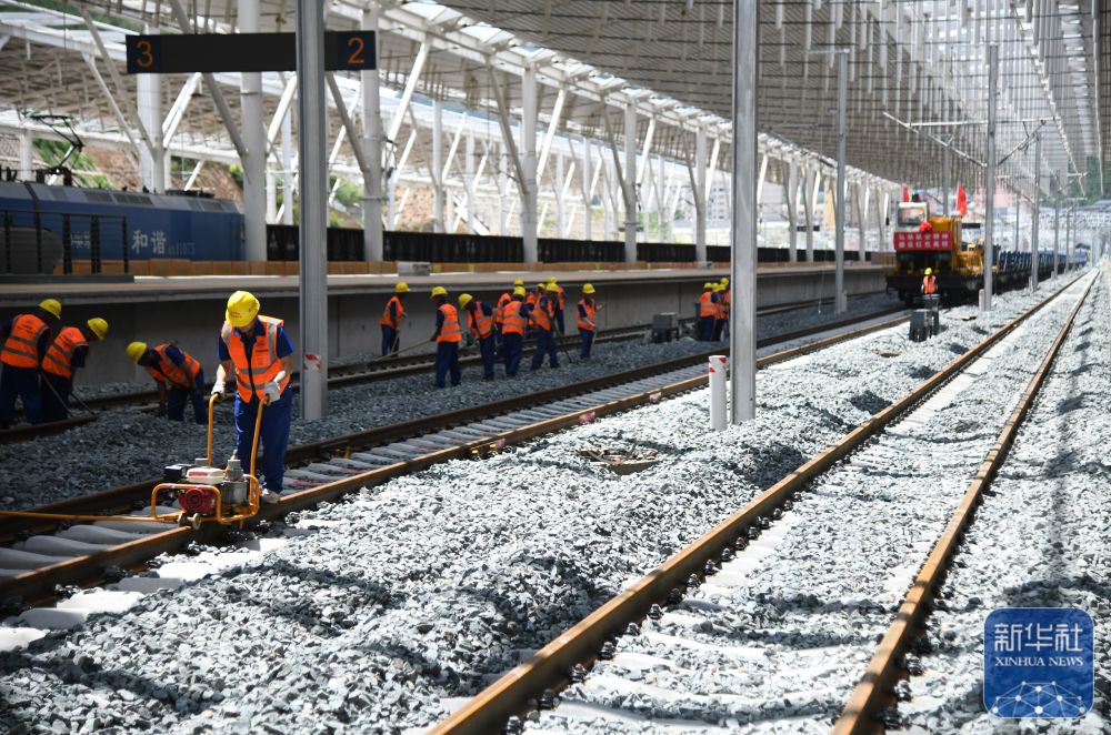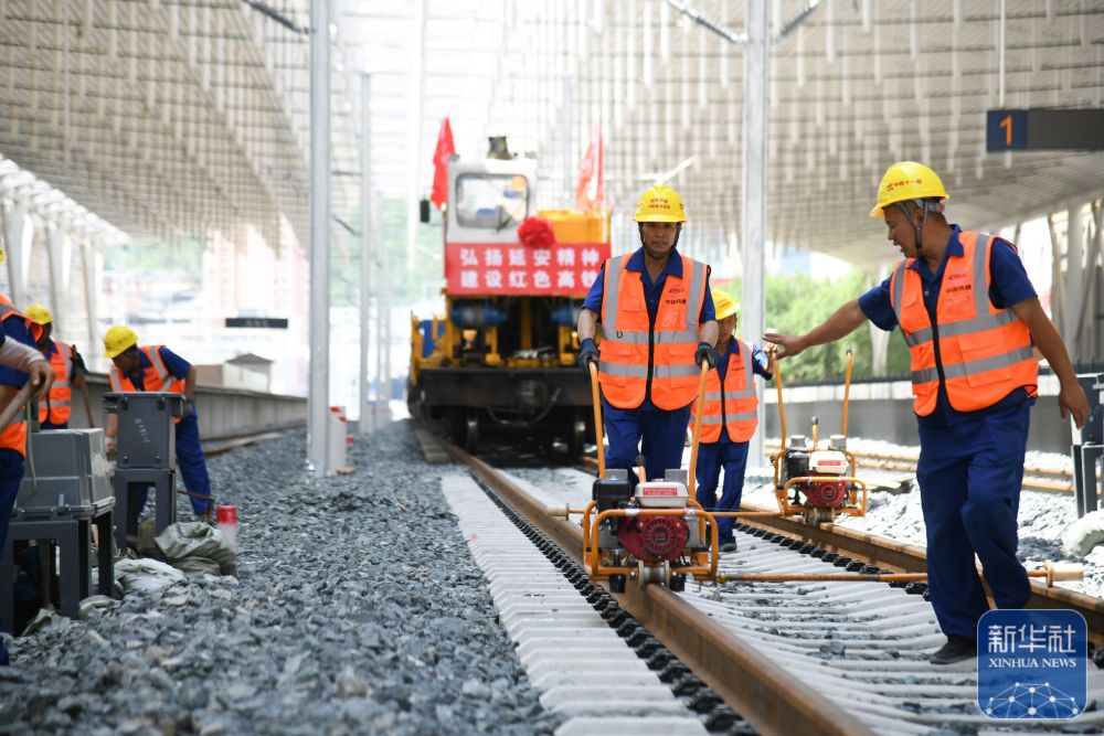 ↑ 7月1日,中铁十一局工人在延安站施工。