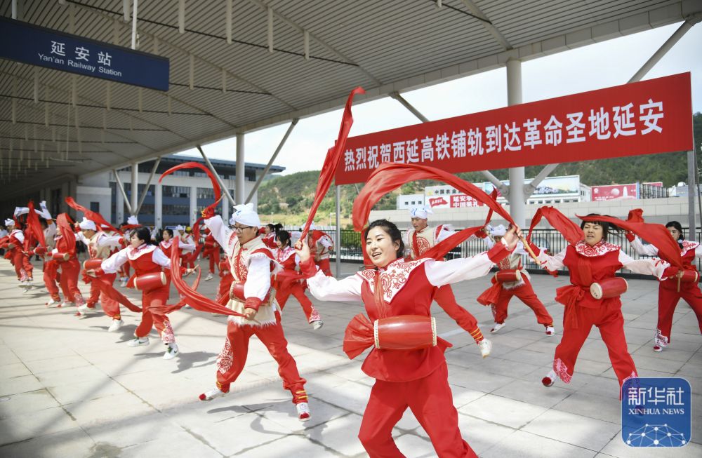 ↑ 7月1日,演员在延安站表演腰鼓庆祝西延高铁实现轨道贯通。