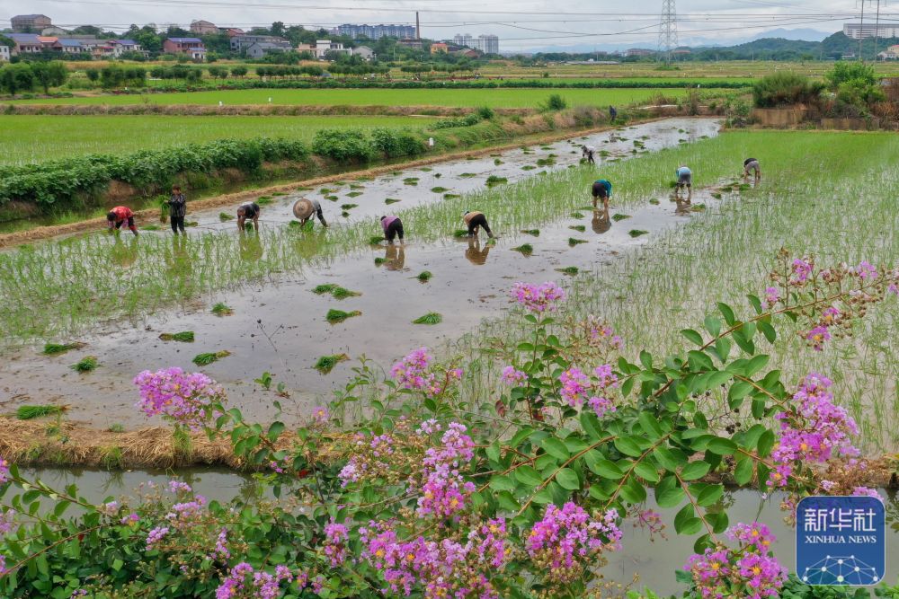 7月22日,农民在湖南省衡阳市衡阳县西渡镇青里村栽插晚稻秧苗(无人机照片)。新华社发(刘欣荣 摄)