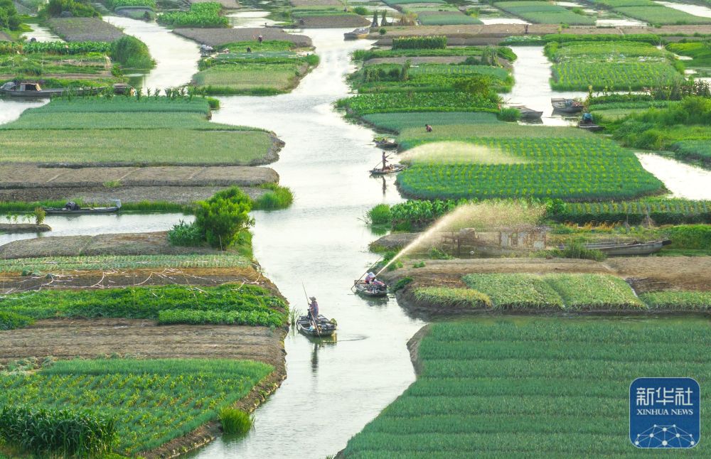 7月22日,农民在江苏省昆山市巴城镇一处有机种植基地劳作(无人机照片)。新华社发(王须中 摄)