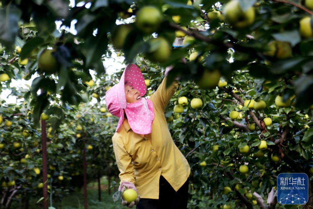 7月22日,农户在江苏省连云港市连云区云山街道李庄村摘梨。新华社发(王春 摄)