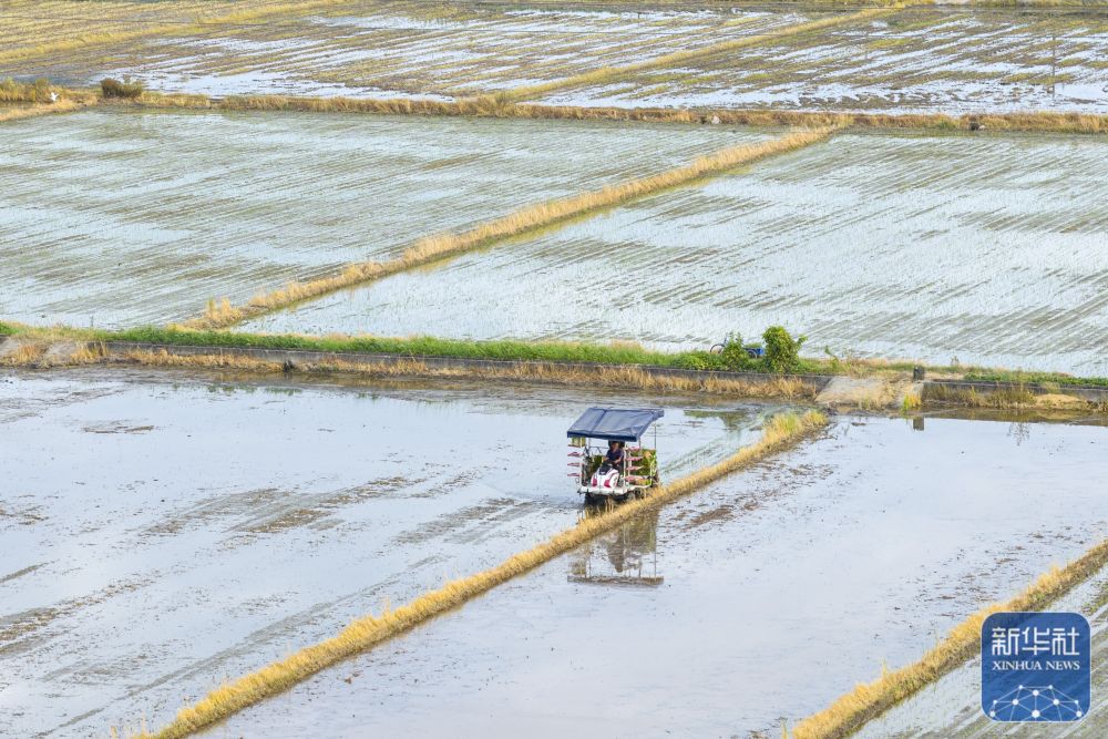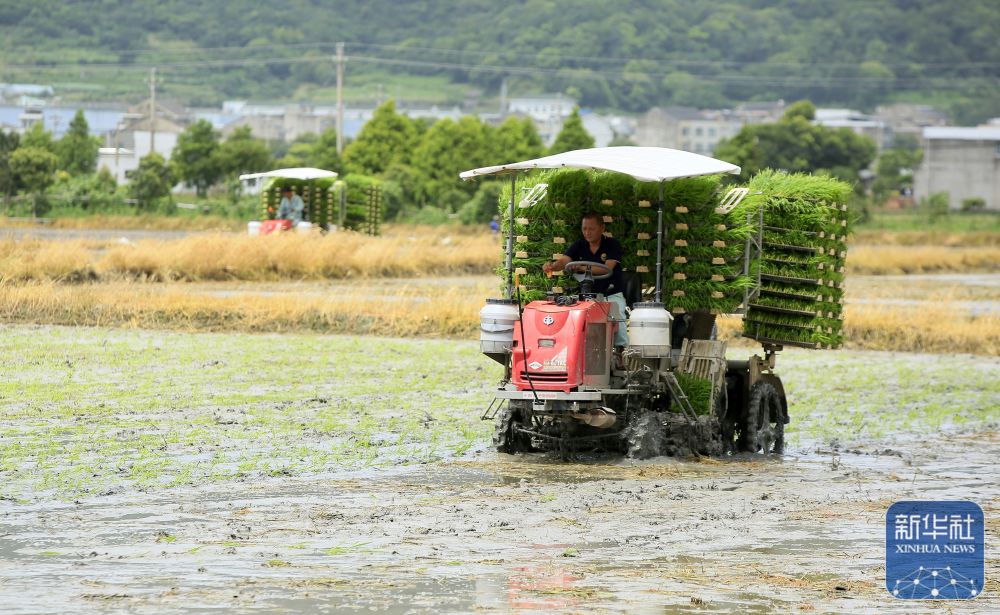 7月22日,浙江省温岭市城南镇东峰山村农民驾驶插秧机插种晚稻秧苗。新华社发(周学军 摄)