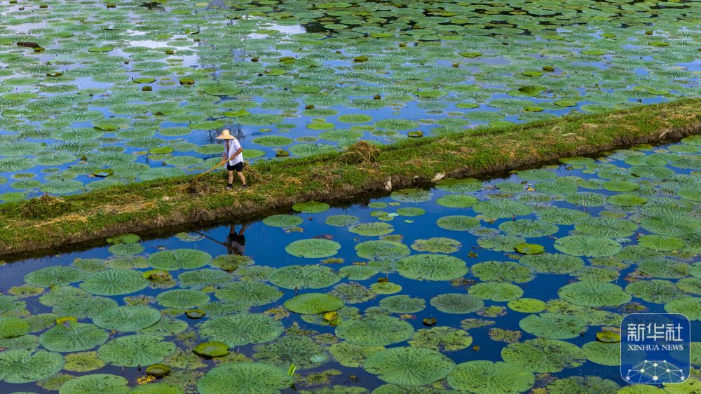 7月22日,农民在江苏省兴化市垛田街道高家荡村的田间劳作(无人机照片)。新华社发(周社根 摄)