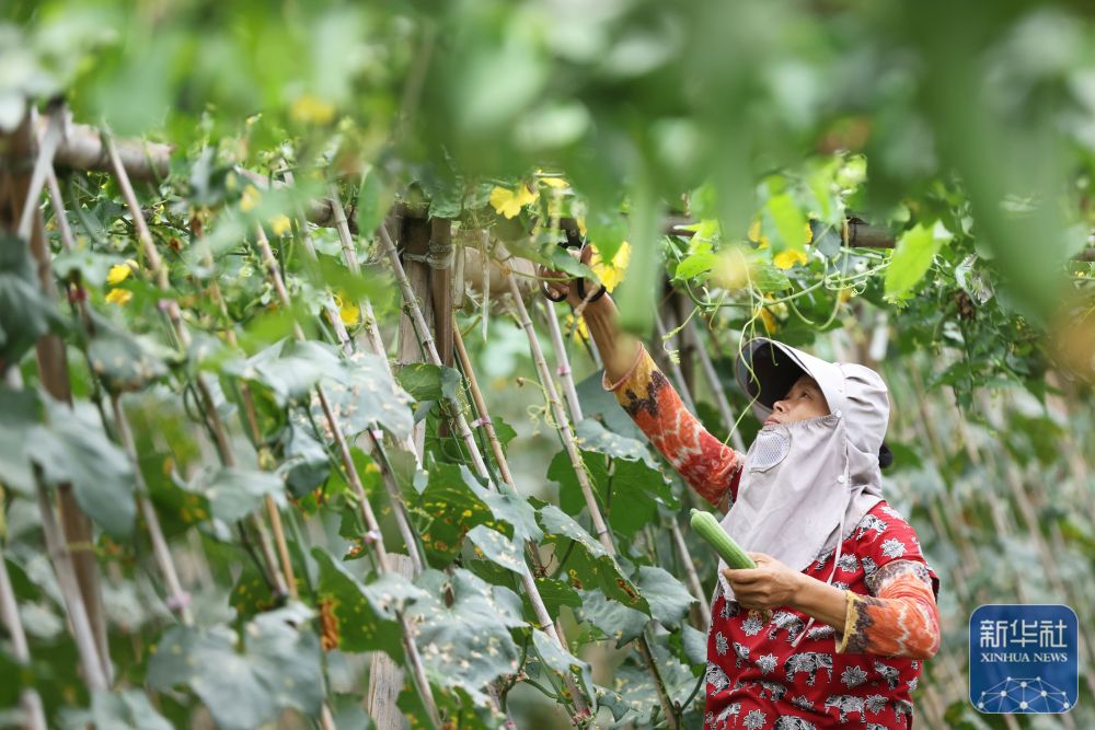 7月22日,菜农在浙江省湖州市德清县乾元镇恒星村蔬菜基地采摘丝瓜。新华社发(倪立芳 摄)