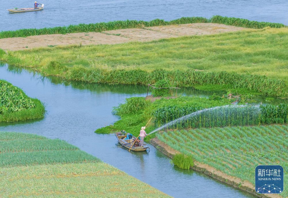 7月22日,农民在江苏省兴化市垛田街道高家荡村的田间浇水(无人机照片)。新华社发(周社根 摄)