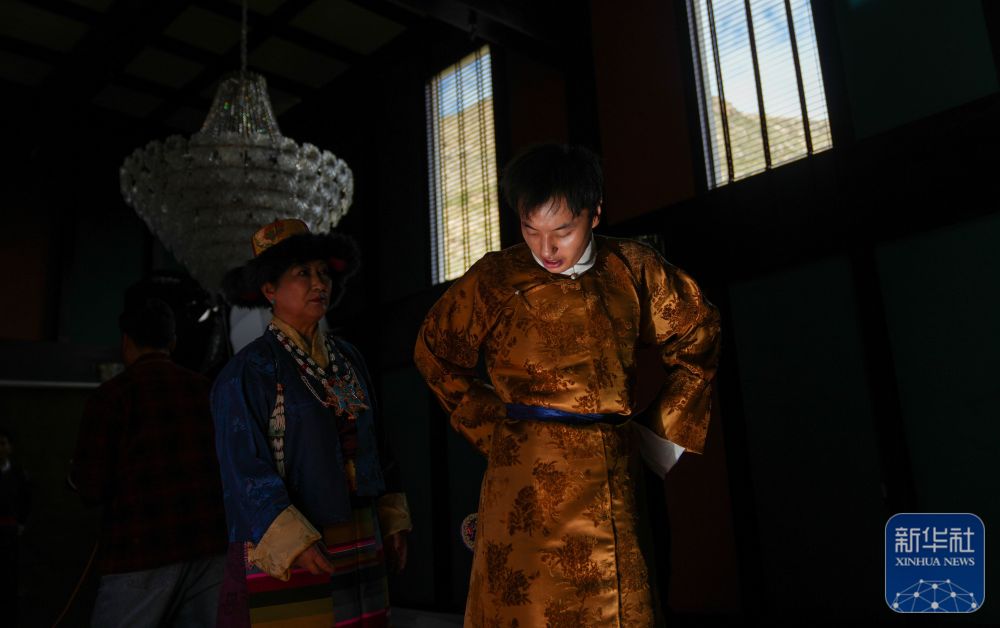 ↑ 班珠丹塔(右)在穿自己设计的男士旅行服(9月9日摄)。新华社记者 晋美多吉 摄