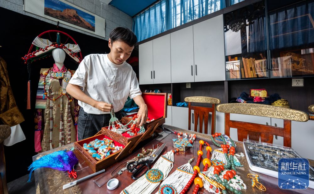 ↑ 班珠丹塔在家中工作室内整理自己做的藏式配件(9月11日摄)。新华社记者 丁增尼达 摄