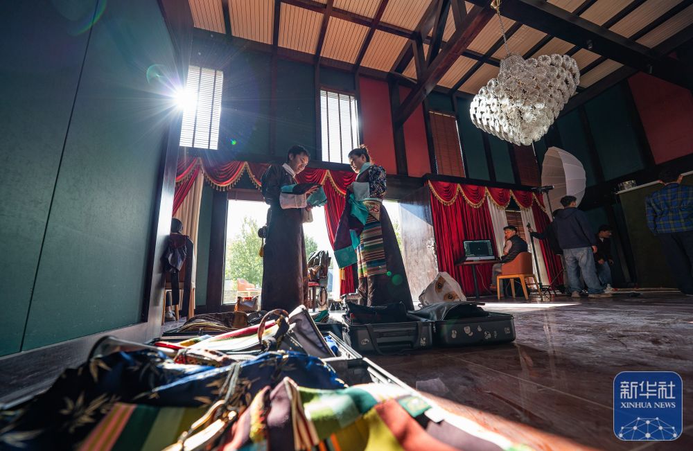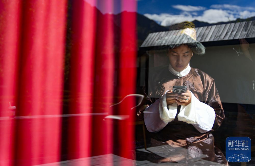 ↑ 班珠丹塔在棚拍间隙处理工作事宜(9月9日摄)。新华社记者 晋美多吉 摄