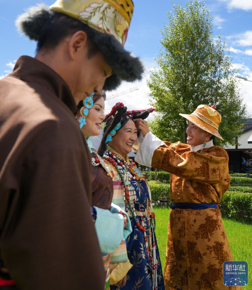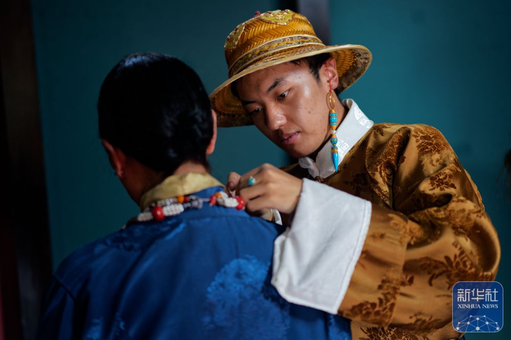 ↑ 班珠丹塔(右一)在为模特调整藏装配饰(9月9日摄)。新华社记者 晋美多吉 摄