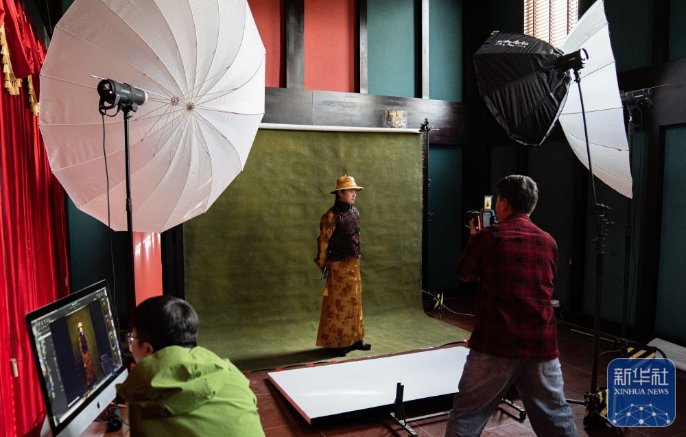↑ 班珠丹塔身着藏装进行棚拍(9月9日摄)。新华社记者 丁增尼达 摄