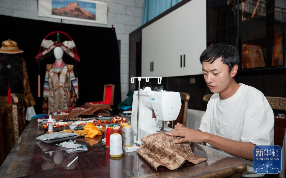 ↑ 班珠丹塔在家中工作室内缝制藏装(9月11日摄)。新华社记者 丁增尼达 摄