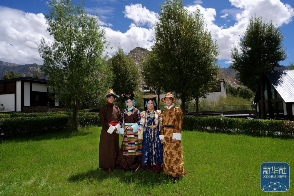 ↑ 班珠丹塔(右一)和模特合影留念,模特们穿着由他设计的藏装(9月9日摄)。新华社记者 张笑宇 摄