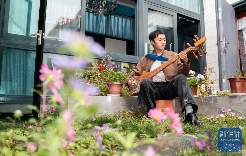 ↑ 班珠丹塔在家中设计藏装间隙弹奏扎念琴(9月11日摄)。新华社记者 丁增尼达 摄