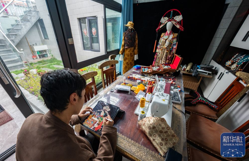 ↑ 班珠丹塔在家中工作室设计藏装(9月11日摄)。新华社记者 丁增尼达 摄