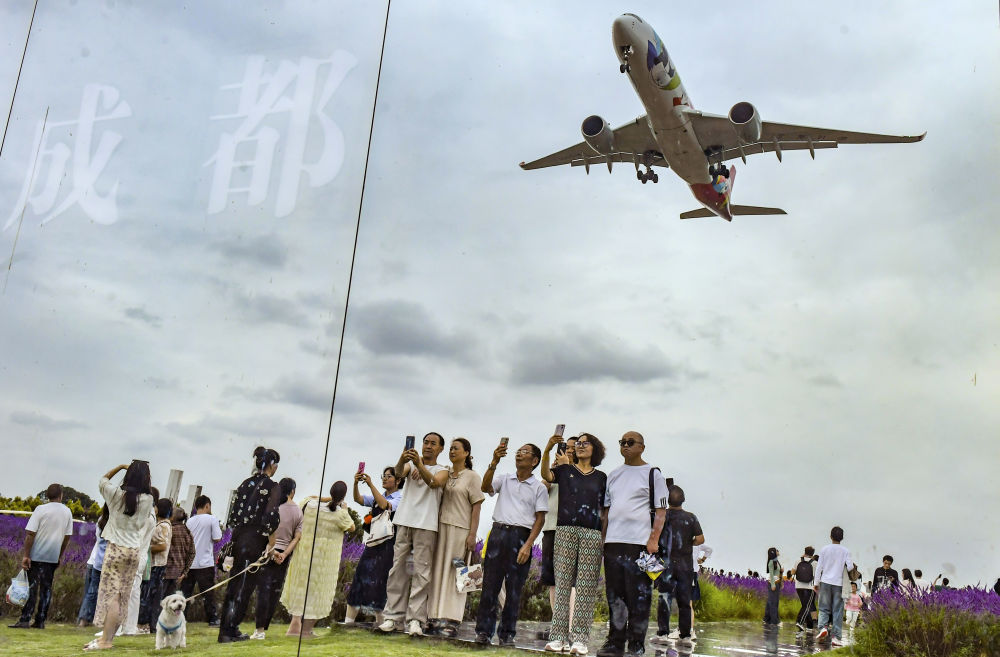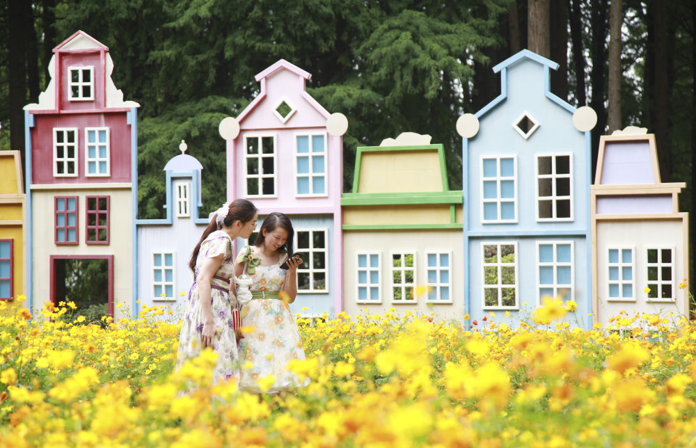 ↑10月4日,在四川省成都市双流区空港花田,游客在一面镜子前拍照。新华社发(李向雨 摄)