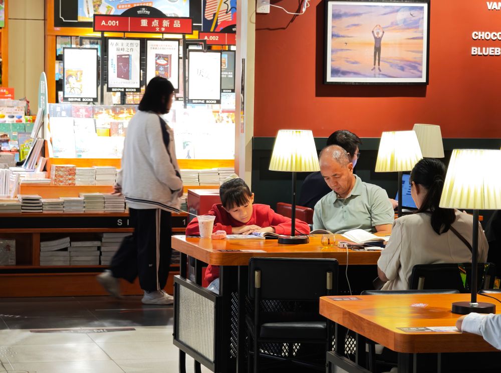 ↑10月5日,家长带着孩子在天津市西青区中北镇一家书店内阅读。新华社记者 李然 摄