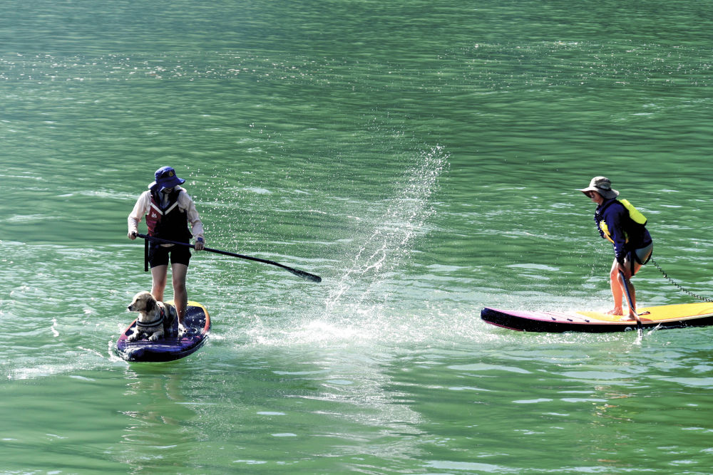 ↑10月4日,游客在云南大理南涧彝族自治县公郎镇猛龙渡体验桨板。新华社发(适志宏 摄)