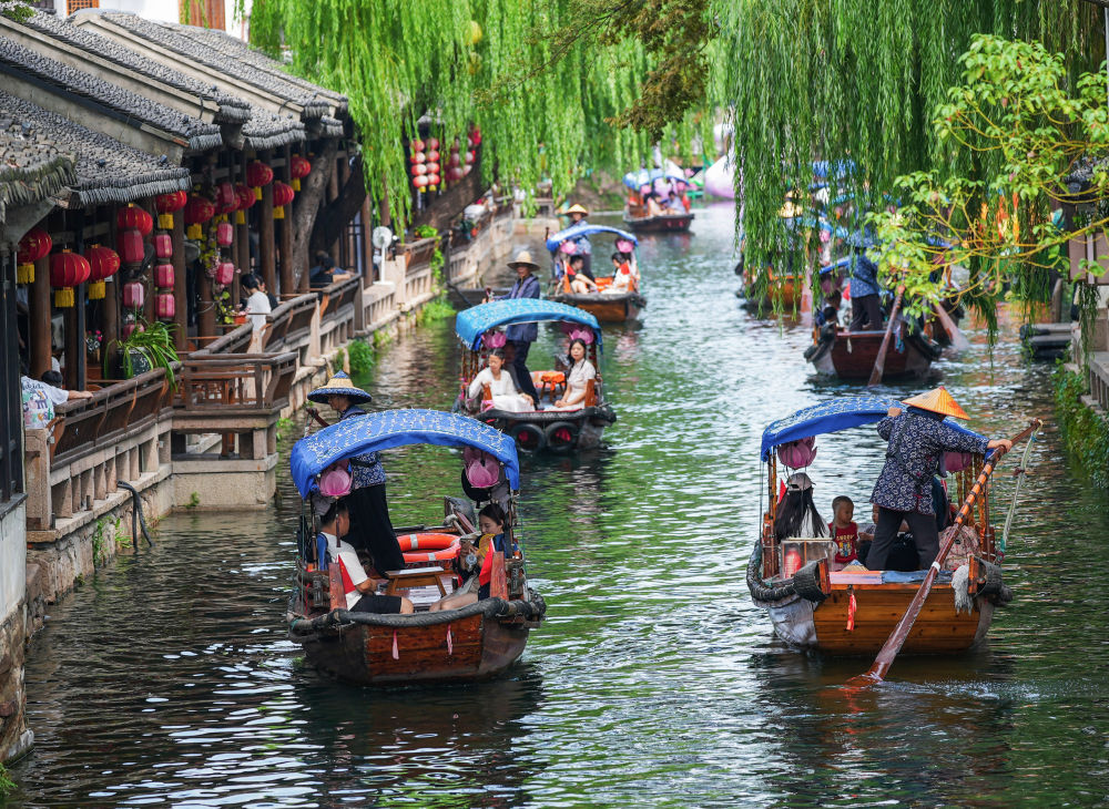 ↑10月5日,游客在江苏省昆山市周庄古镇游览。新华社发(周社根 摄)