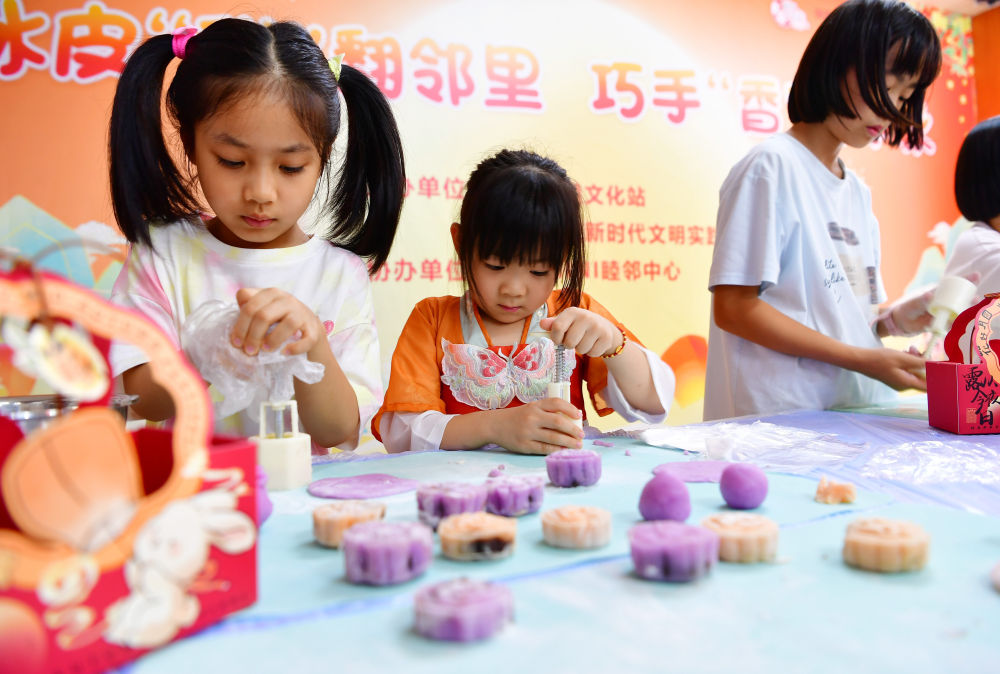↑ 10月5日,在江苏省无锡经开区太湖街道方庙社区举办的迎中秋主题活动上,小朋友体验制作月饼。新华社发(还月亮 摄)