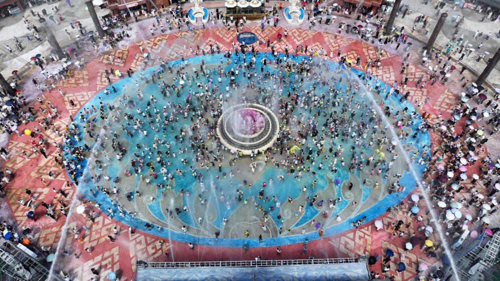↑ 10月5日,游客在云南省景洪市的傣族园景区参加泼水活动(无人机照片)。新华社发(李云生 摄)