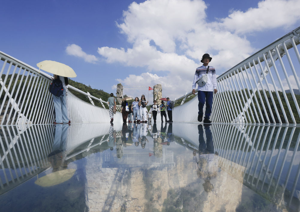 ↑ 10月5日,游客在湖南张家界大峡谷景区高空玻璃桥上游览。新华社发(吴勇兵 摄)