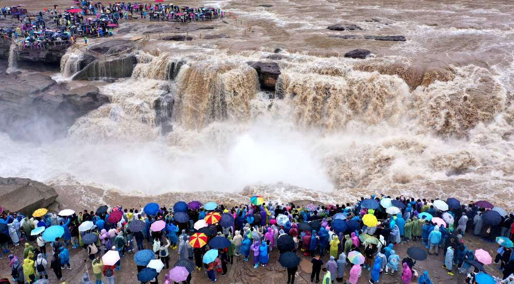 ↑ 10月5日,游客在山西吉县黄河壶口瀑布景区观瀑(无人机照片)。新华社发(吕桂明 摄)