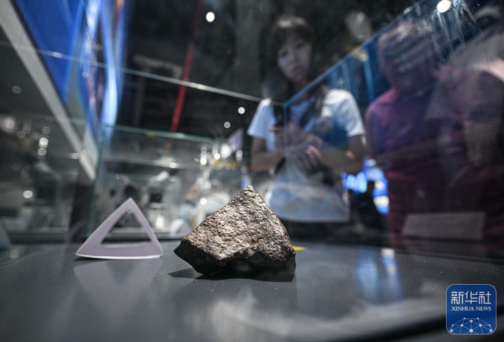 ↑ 10月7日,游客在文昌航天科普中心观看陨石。