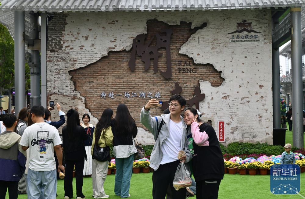 ↑ 10月7日,游客在河南省开封市万岁山武侠城拍照游玩。新华社记者 郝源 摄