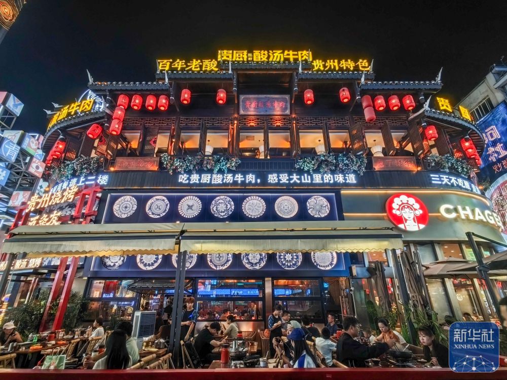↑ 10月7日晚,人们在贵州省贵阳市青云市集品尝美食。新华社发(龙建睿摄)