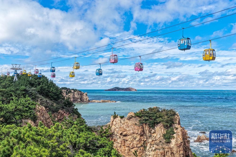 ↑ 10月7日,在山东省荣成市成山头风景区,游客乘坐缆车观景(无人机照片)。新华社发(李信君摄)