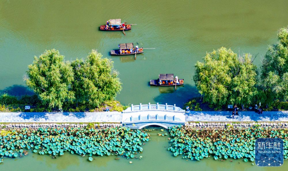 ↑ 10月7日,游客在江苏兴化里下河国家湿地公园乘船游玩(无人机照片)。新华社发(周社根摄)