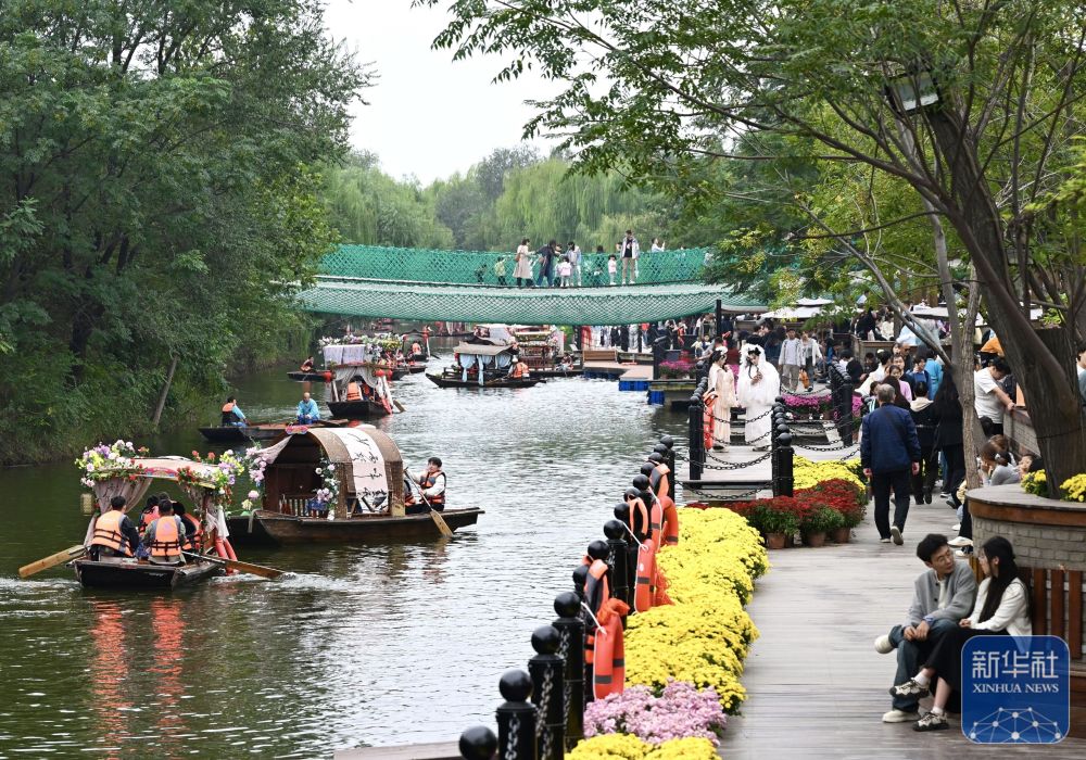↑ 10月7日,游客在河南省开封市万岁山武侠城游玩。新华社记者 郝源 摄